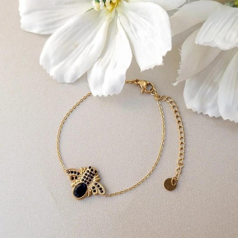 Brățară elegantă placată cu aur 14K – design sofisticat cu pandantiv albinuță și pietre negre, 15 cm, Naiara®