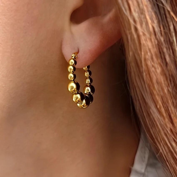 Adaugă un strop de modernitate și rafinament colecției tale cu acești cercei eleganți, placați cu aur de 14K, marca Naiara®. Designul lor contemporan, cu bile aurii, adaugă un aer sofisticat și fresh, perfect pentru a înfrumuseța orice ținută, de la cele casual la cele de seară.