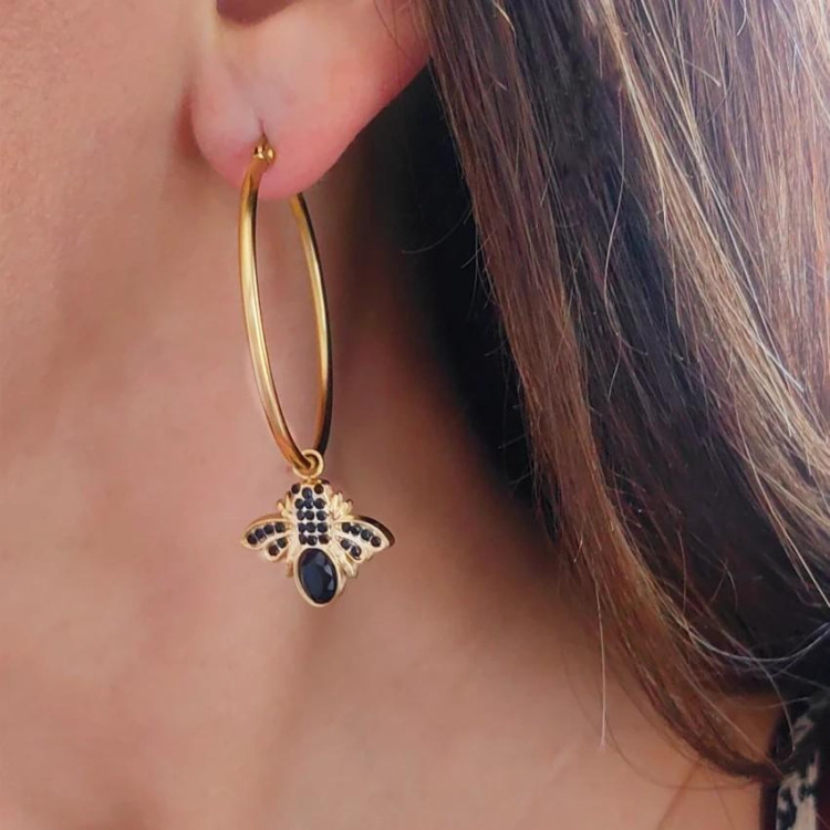 Cercei eleganți placati cu aur 14K – design statement cu cercuri și pandantiv albinuță cu pietre negre, 2.1 x 6 cm, Naiara®