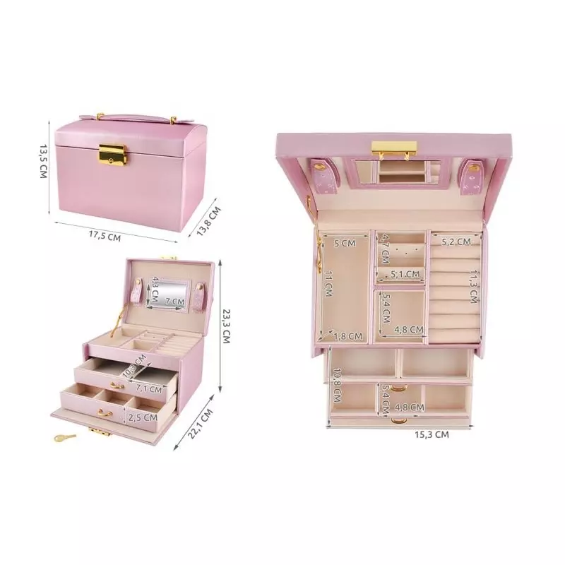 Este prevazuta cu 20 de compartimente in care pot fi depozitate bijuteriile. Cutia are un sistem de inchidere cu cheie, ceea ce ofera securitate pentru continutul din interiorul acesteia.