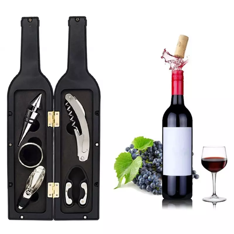 Un set bogat (6 bucăți) pentru vin ambalat într-o cutie estetică în formă de sticlă de vin.