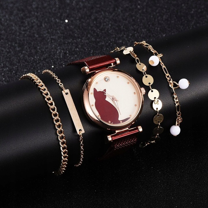 Set ceas damă elegant Rinnandy model pisica, curea mesh metalică si 4 bratari aurii, Noem®