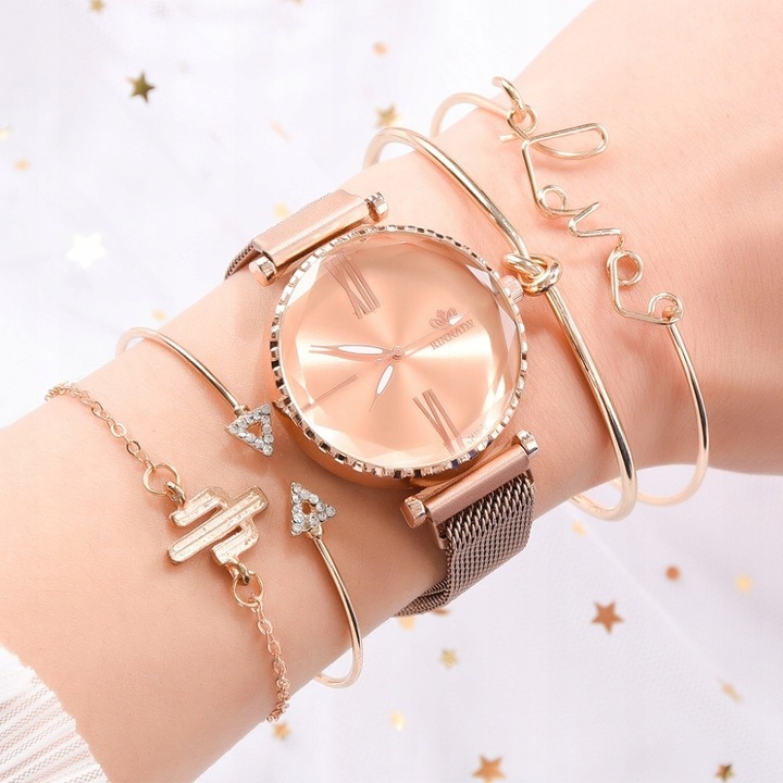 🔸 4 brățări complementare incluse – Pot fi purtate individual sau în combinație cu ceasul, pentru un efect glamour subtil și elegant.