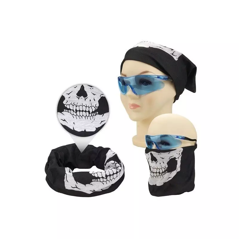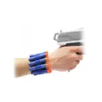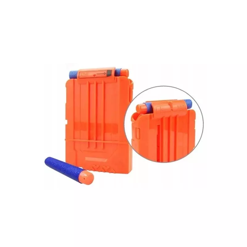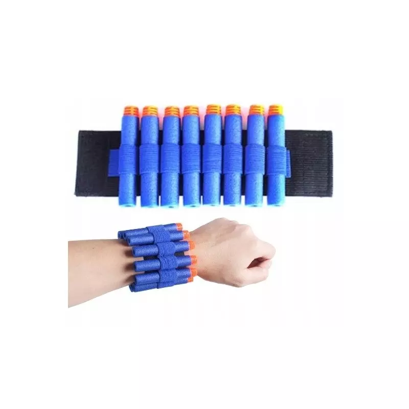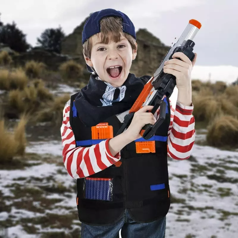 Setul contine gloante din spuma, ochelari de protectie, bandana model craniu, banda pentru mana, vesta, cartus pentru gloante.