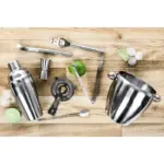 Setul include un shaker de 550 ml, o frapiera cu capacitatea de 1 L, o masura dubla de 5, 20, 30 si 40 ml, cleste pentru gheata, lingura pentru amestecat, o sita, un desfacator, cutit pentru taiat citrice.
