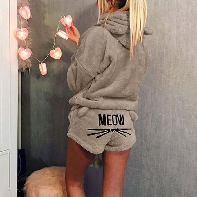 🔸 Detalii simpatice – Gluga cu urechi de pisică și inscripția „Meow” adaugă un farmec aparte și o doză de veselie ținutei tale de relaxare.